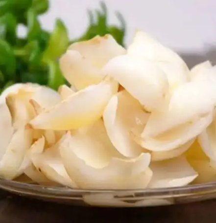 選擇成熟度好、光滑細(xì)膩、果肉肥厚、鱗片大小一致、潔白完好、無病斑蟲眼的鮮百合作原料,用小刀削去百合根基,去除殘根,分片分級輕輕刷洗后沖洗干凈,用鐵鍋燒好沸水待用,百合鱗片下鍋后,保持水沸,并均勻攪動。煮燙的時間以原料略軟,掰斷鱗片時有清脆響聲,有較強(qiáng)彈性為度,一般需4~6分鐘。撈出煮燙好的百合鱗片,放入冷水冷卻散熱,然后撈出瀝干備用。